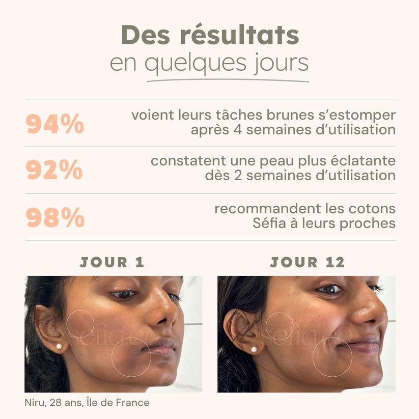 Il est recommandé d'utiliser nos cotons nettoyants et exfoliants 1 à 2 fois par jour.